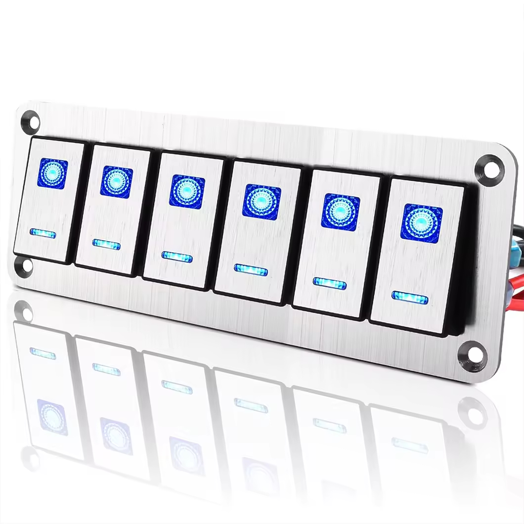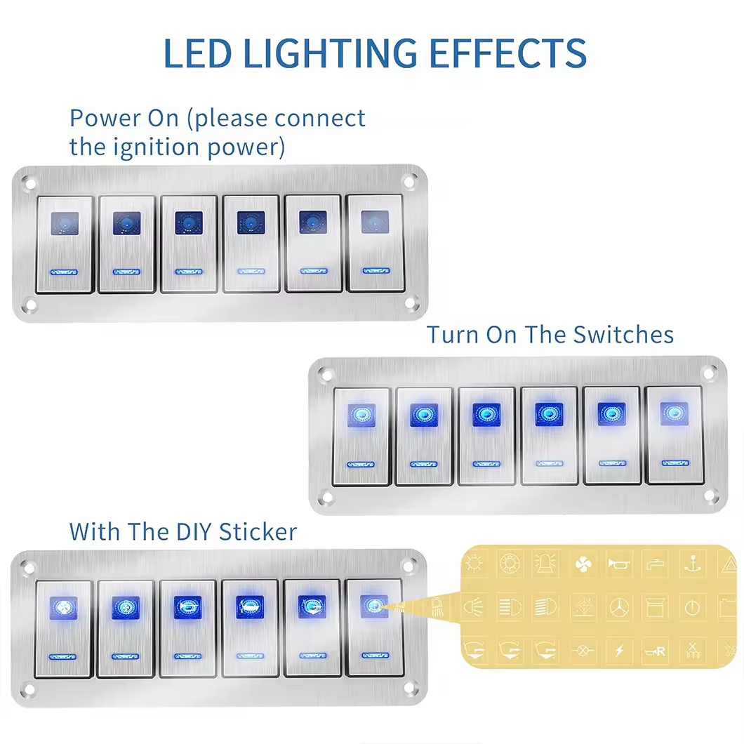Illuminating Blue LEDs: Each rocker switch is equipped with dual blue LED indicators, allowing you to effortlessly monitor the status of each switch-controlled circuit. These bright LEDs also make it easy to locate your switches in low-light conditions.